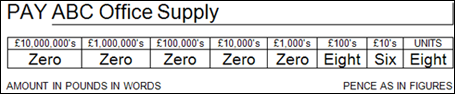 In the above example, using pre-printed checks and the Forms Designer module, you can manually add the Currency Text formatting option to each box. These fields will not be on the check by default. If you have blank check stock, you must draw each separate box using the Forms Designer module, add the labels, and the correct formatting Currency Text for each box to the checks manually. Note that the code will count how many units are contained in the amount on the check based on the Currency Text formatting option selected.