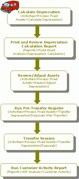 (Activities>Fixed Assets>Transfer Depreciation/Disposals). - Transfer the session (Activities>Fixed Assets>Transfer Depreciation/Disposals). All fixed asset sessions post immediately at transfer. They will have a JVD (Journal Vouchers - Depreciation/Disposal) transaction type.