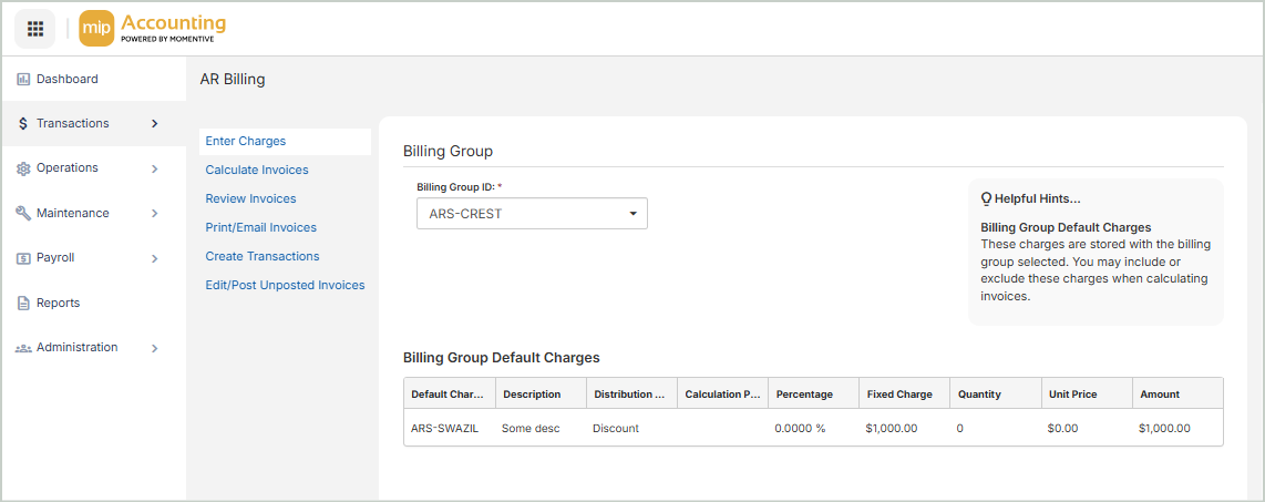 When you navigate to AR Billing from the navigation menu, you'll land on the Enter Charges page. The left-hand menu is organized in the suggested order of entries to be made. Start with Enter Charges and make your way down to Edit/Post Unposted Invoices.