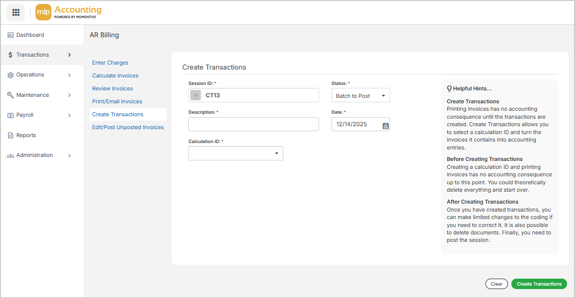 Generate general ledger transaction entries from a calculated invoice. The transaction entries are generated using the charge code's general ledger account, along with the charge code's distribution code information (see Add / Edit Charge Codes). The offset assignment for AR Invoices (ARB) is used to generate the AR portion of the entry.