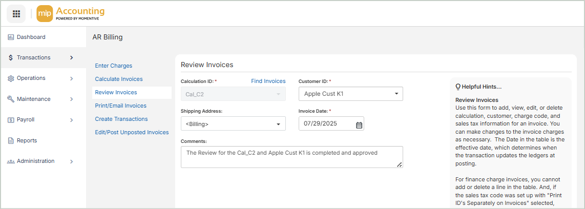 Calculation ID: Select an existing calculation ID. This is the calculation ID that was entered on the Calculate Invoices section.