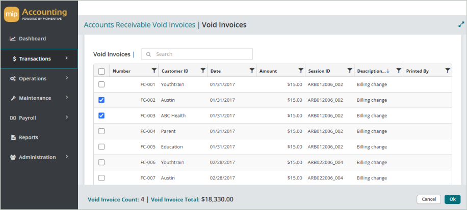 When you've finished selecting your invoices to be voided, select Ok. You'll be directed back to the Void Invoices page where you can post your session.