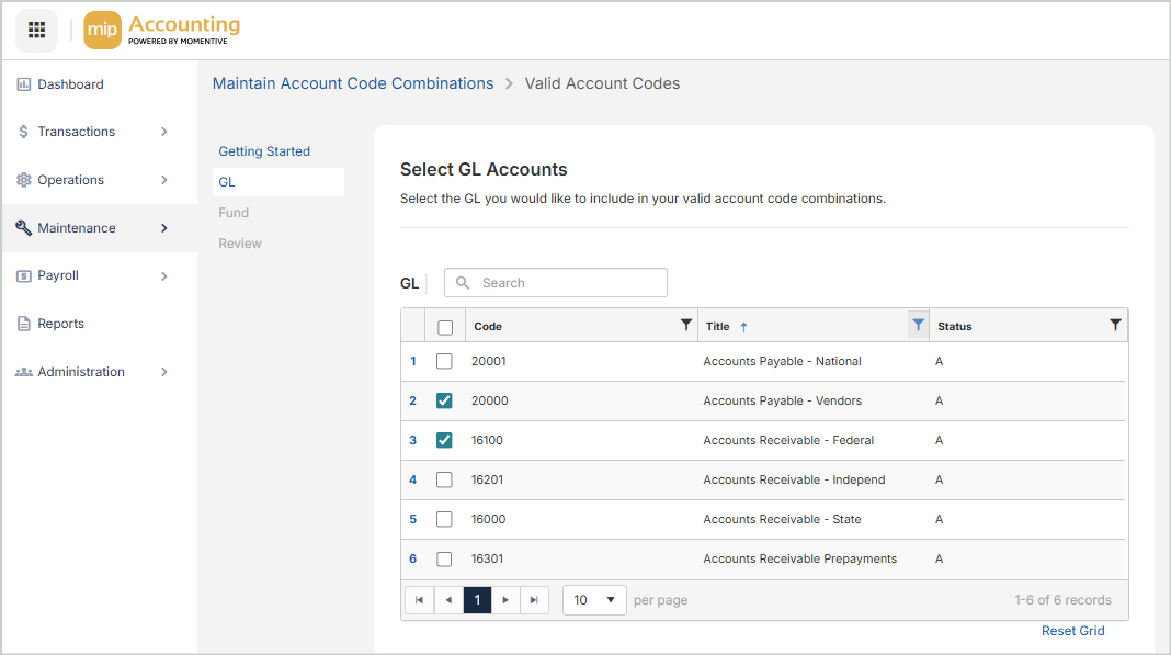 Select the GL accounts you'd like to include in your valid account code combinations.