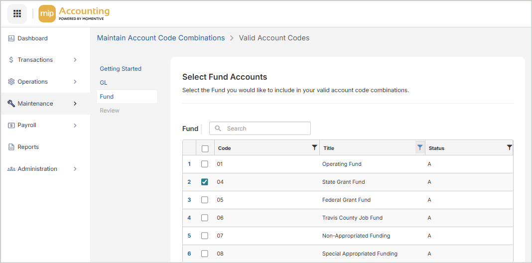 Select the Fund accounts you'd like to include in your valid account code combinations.