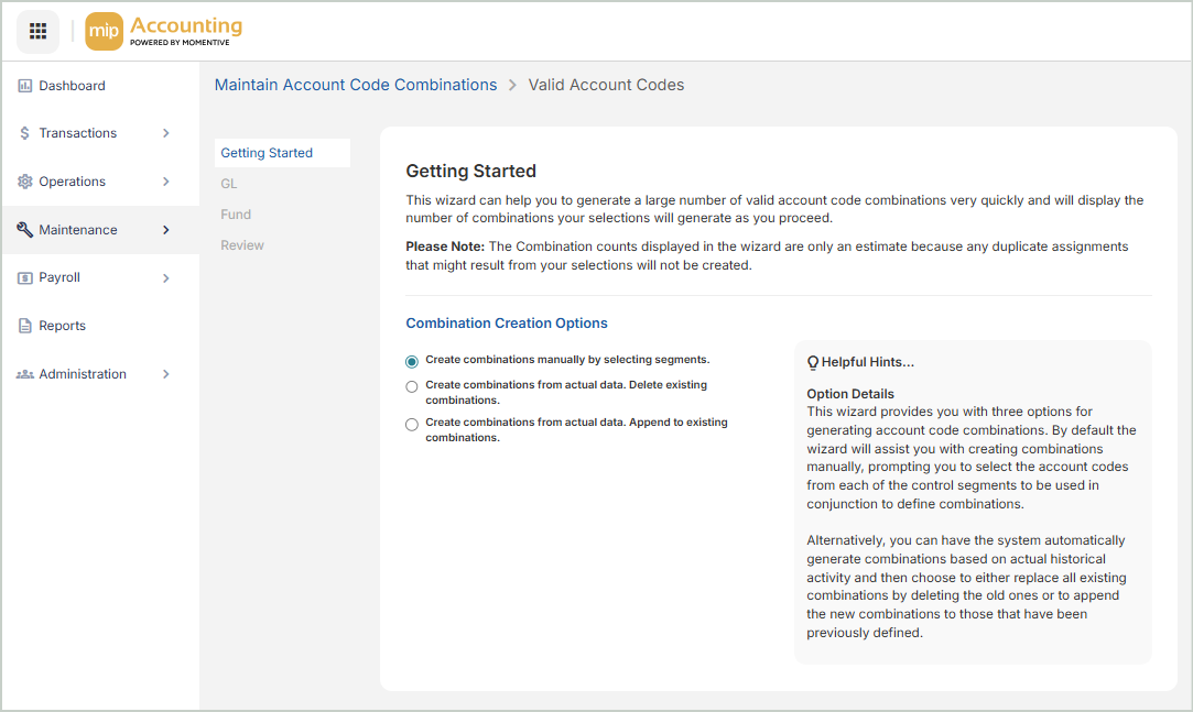 Create account code combinations for your organization. Account code combinations are specific groupings of segments from your chart of accounts - such as fund, department, program, or account - that define where a transaction is recorded in your accounting system. MIP validates all transaction and distribution code entries against the account code combinations you've set up, preventing the use of invalid combinations.