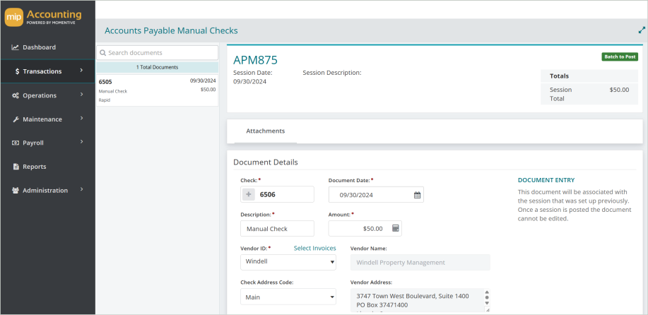 Record checks that have been manually written to pay posted AP invoices. Entering and posting a manual check reduces the balance of an existing invoice.
