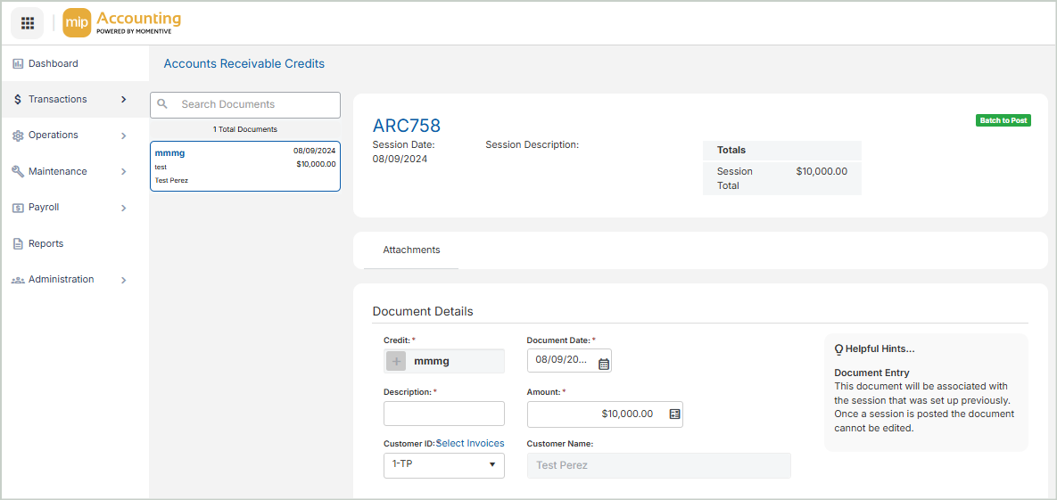 Amount: Enter the amount of the credit. The document amount and the net of the transaction lines must equal if the session status is BP.