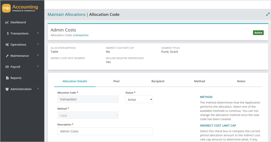 The allocation method chosen for the code. See Allocation Methods for more information. The indirect cost rate cap is applied according to the following rules: Rule 1:If the indirect cost limit is calculated to be zero or positive (Debit cap), then the Proposed Allocation is only adjusted if it would cause the recipient accounts to exceed the indirect cost limit in a positive (debit) direction. For example: