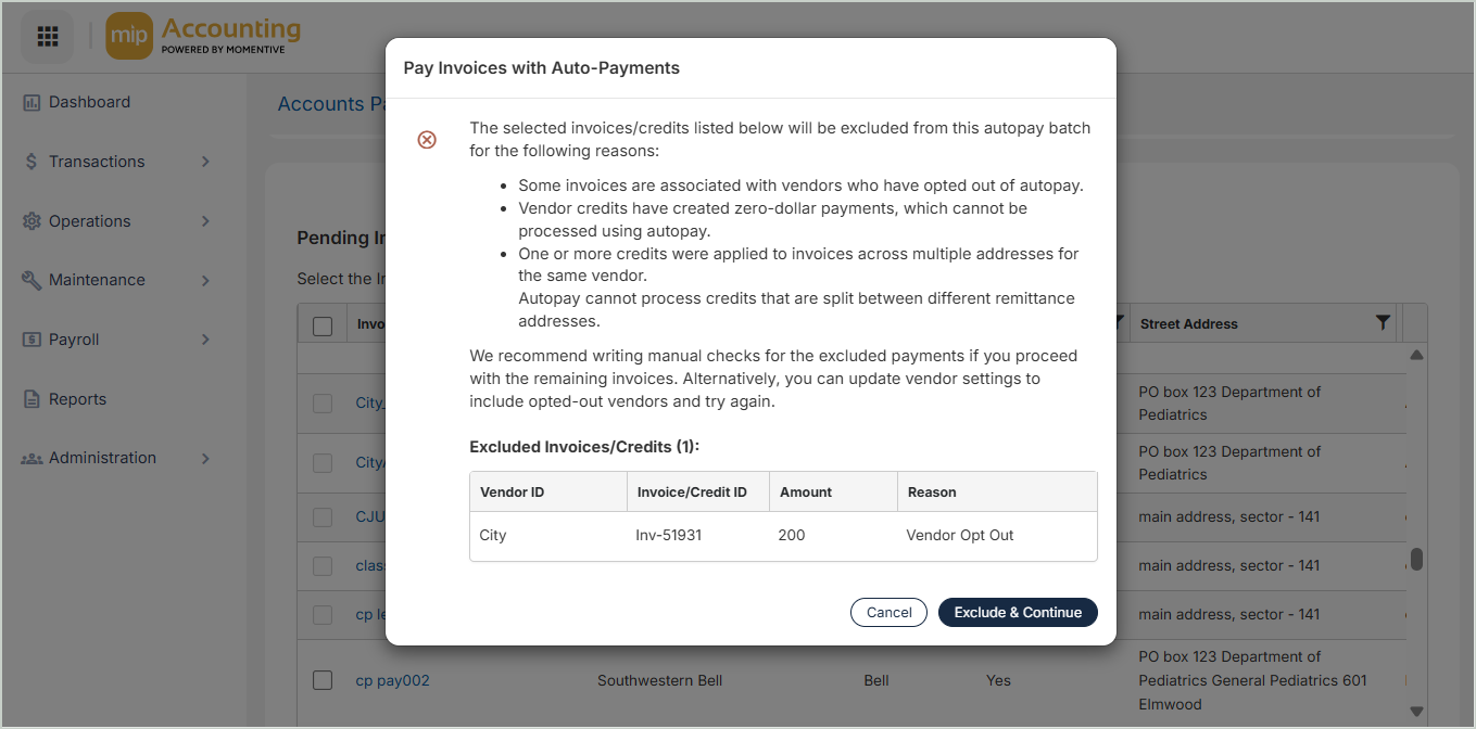 Exclude & Continue - Exclude these invoices from the payment batch and continue with auto pay for your remaining invoice selection.
