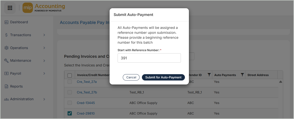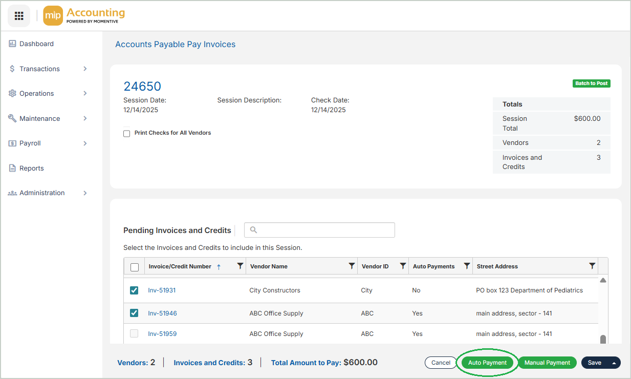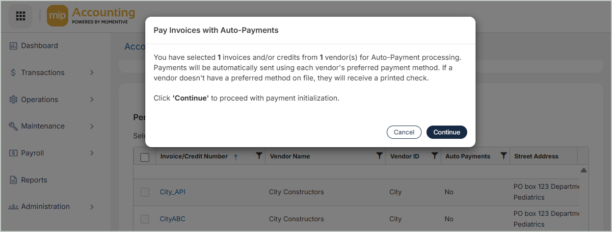 Once you've completed the onboarding process and enabled the Auto Payments feature under Module Setup, you can begin making auto payments in MIP.