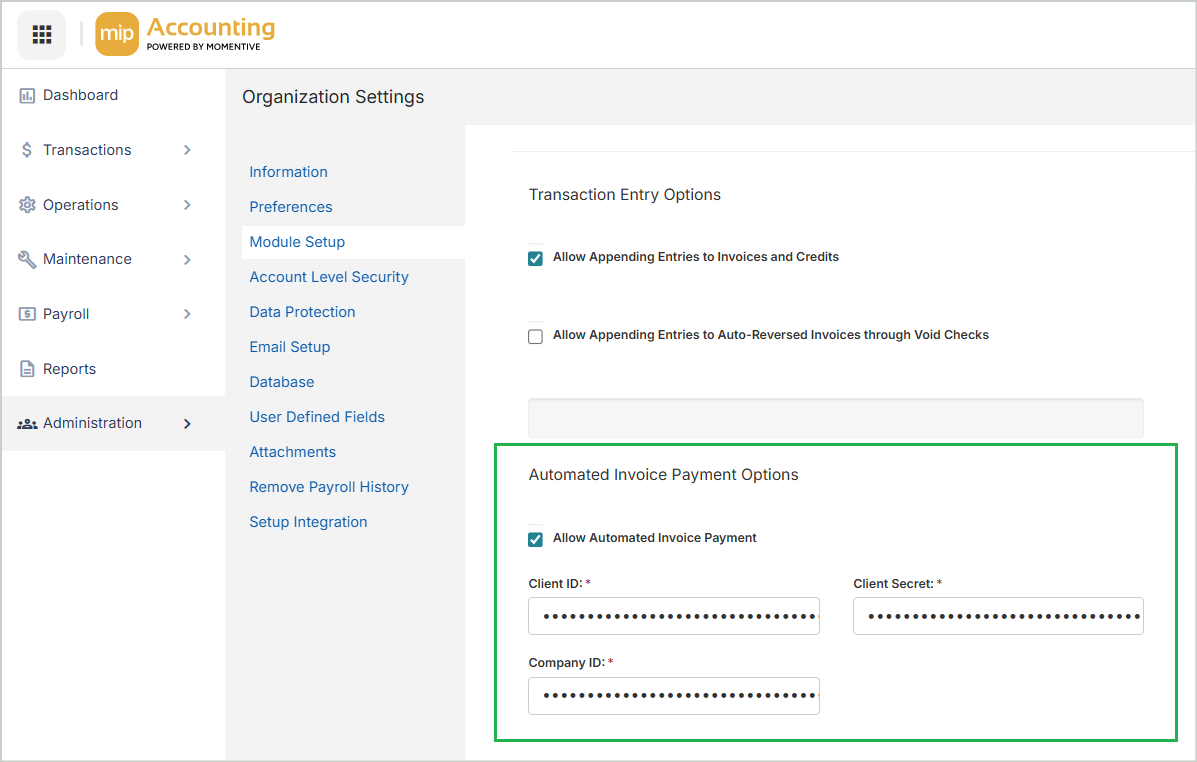 As one of the final steps in the onboarding process, the MIP Services team will enable the Automated Payments feature in MIP for your organization. The steps below outline how the feature is enabled.