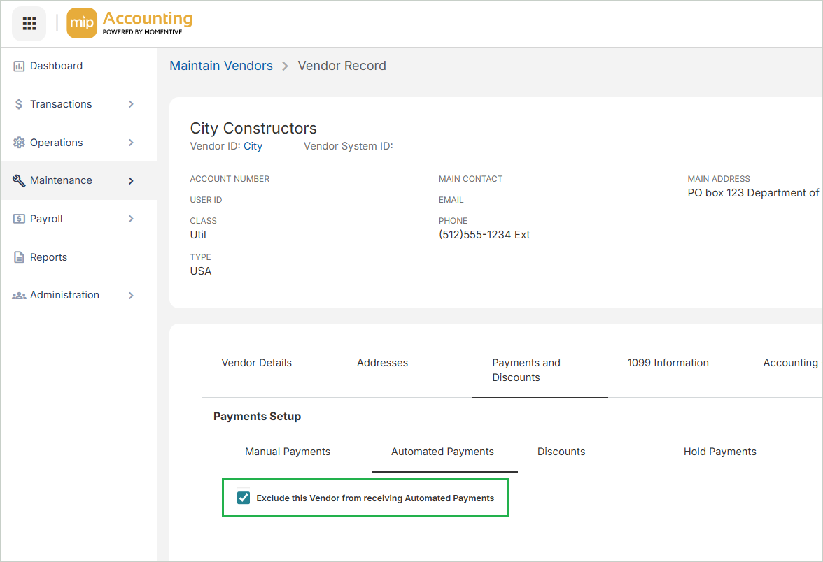 Select the option to Exclude this Vendor from Receiving Automated Payments.