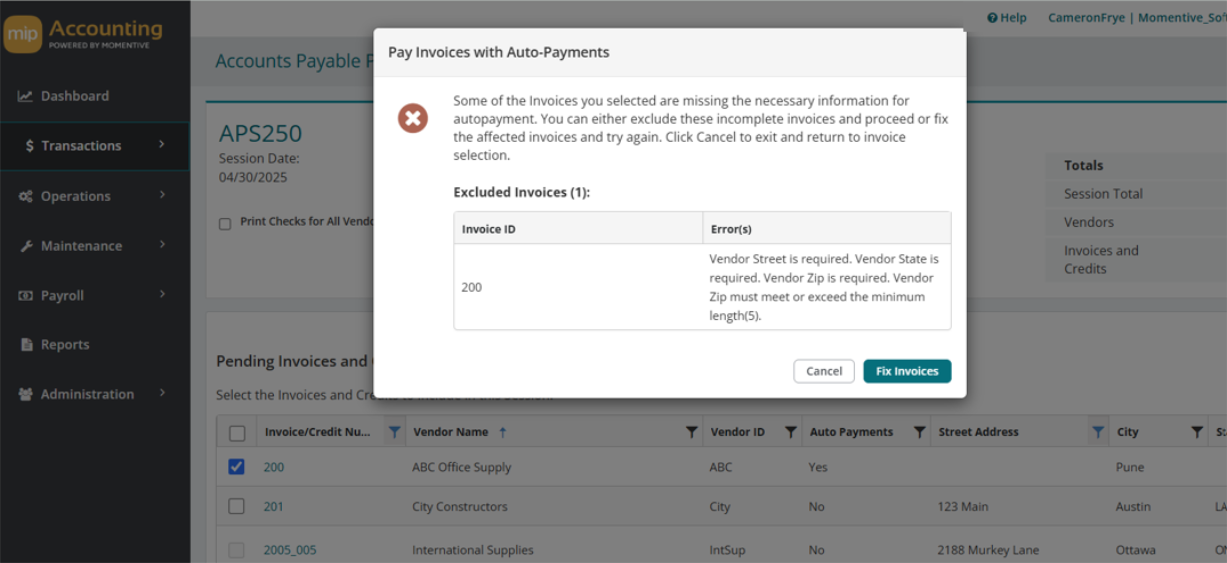 Fix Invoices - If you’d like these invoices to be included in the submission to Corpay, select this option to fix the invoices and fill in the missing values directly from the grid. Once you enter the missing vendor information for an invoice, that information will be updated on the Vendor Record.