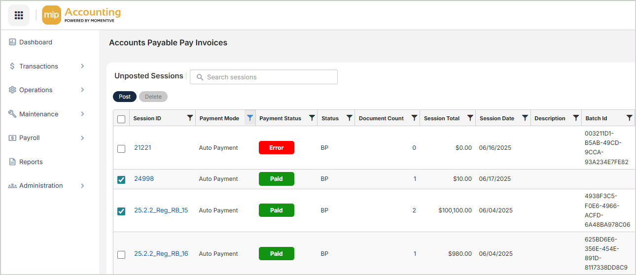 You have the option to delete unposted Auto Payment sessions under specific conditions. This gives you greater control to remove unused sessions or those with payment issues, helping maintain data accuracy between MIP and Corpay.