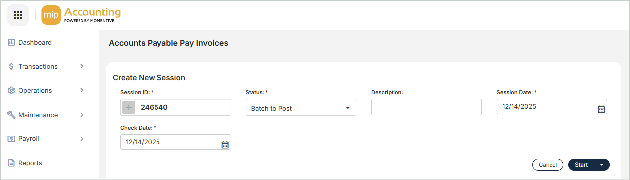 Once you've submitted your invoices for auto payment, the data is sent to Corpay who will handle the payment processing. MIP creates an APS (AP System Generated Checks/Voucher) session for each auto payment batch. You can keep track of the status of your auto payments through the Unposted Sessions grid (Transactions > Accounts Payable > Pay Invoices).