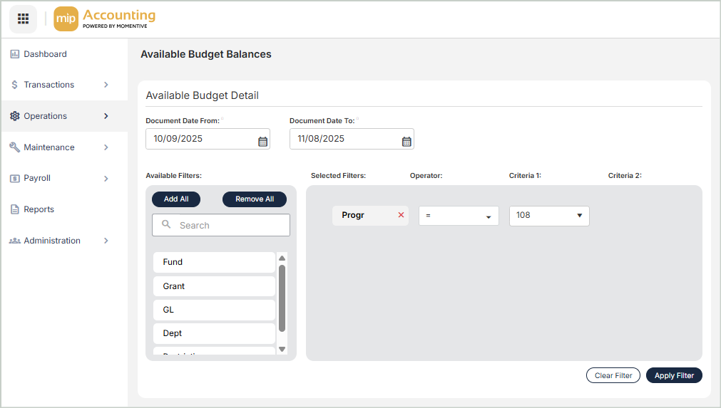 View the beginning balance, current activity, and ending available budget balances in the system. You can filter on specific dates, accounts, and criteria to determine which data to display in the grid.