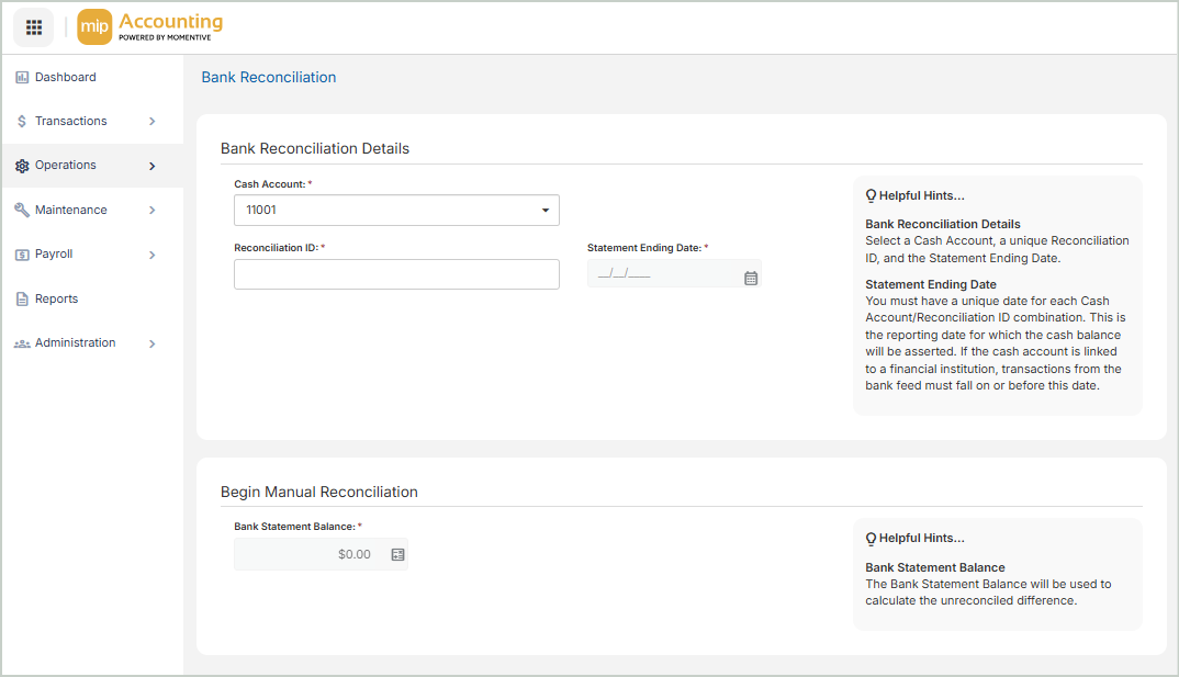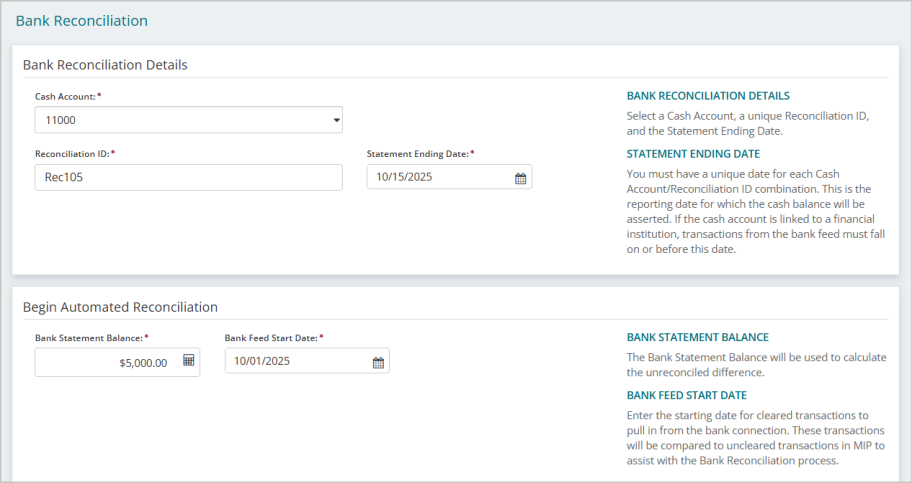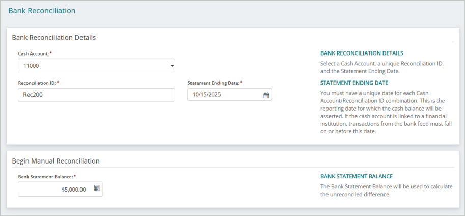 Statement Ending Date: Enter the ending date of the bank statement you're reconciling.