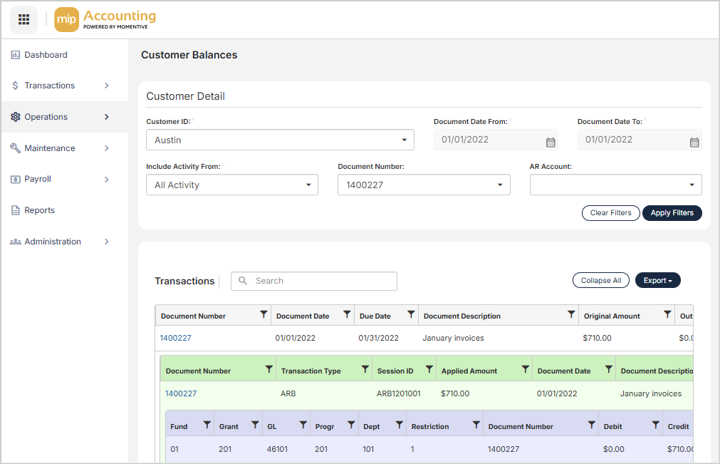 The Transactions grid displays the results based on the filters you applied above, with columns varying depending on the chosen AR code. You can drill down into specific transactions and documents. You can Export your data in PDF or XLS format.