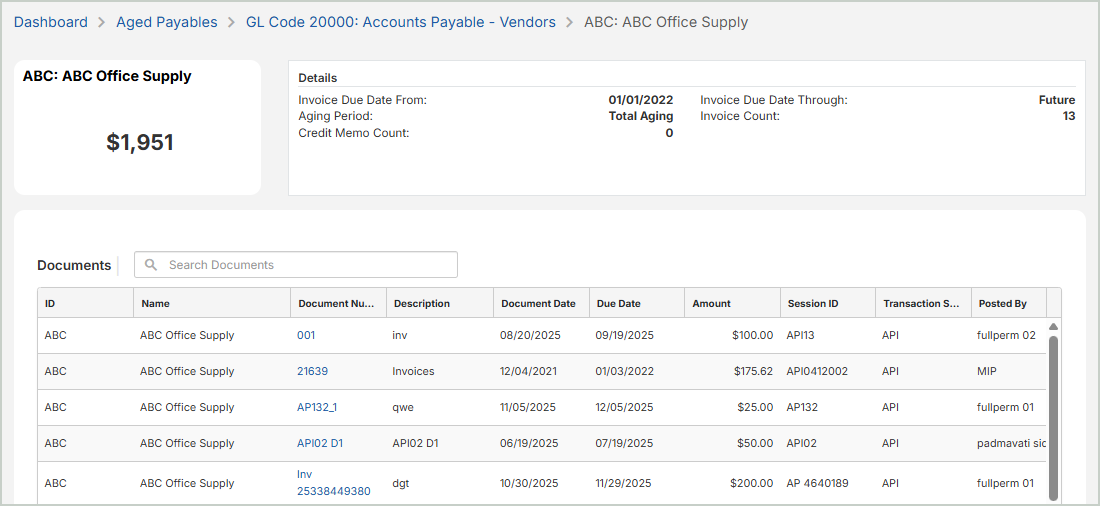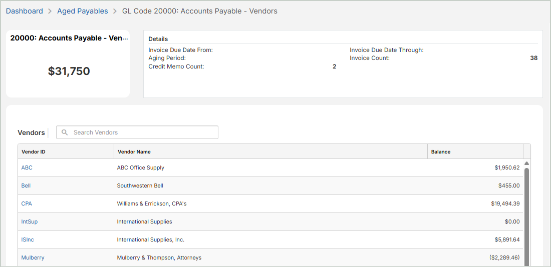 Vendor Total: The total amount of aged payables for the selected GL code