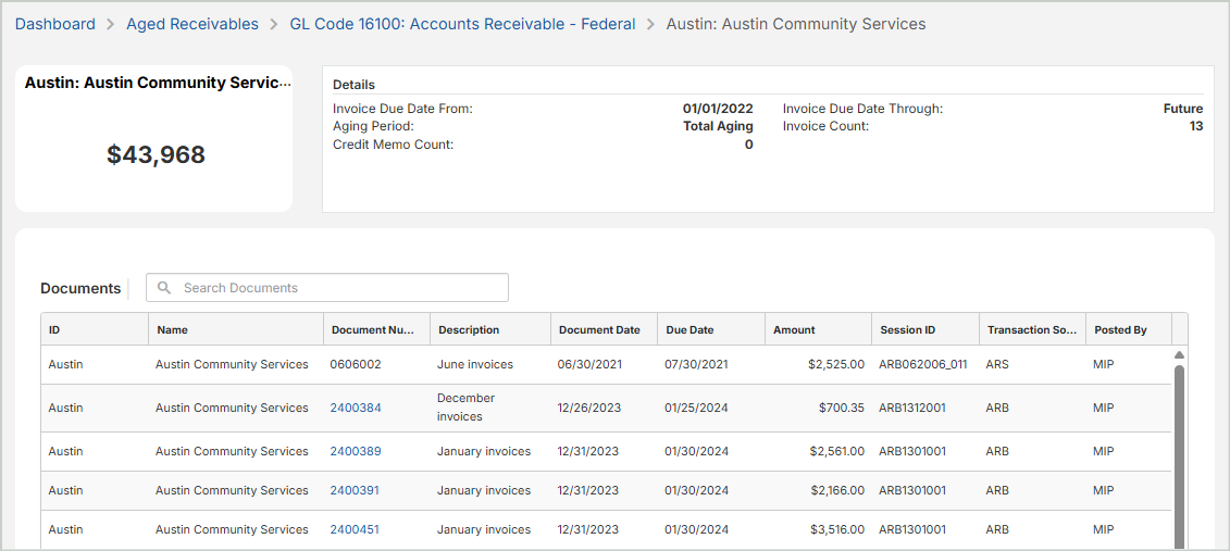 The Aged Receivables chart displays the outstanding amounts owed to your organization. Hover over a bar in the chart to view the exact amount. Select a bar to drill down into the corresponding aging range and access related GL code records and customer details.