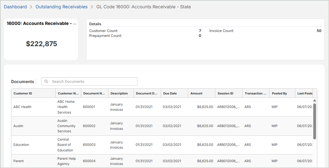 Customer Count: The total number of customers specific to the GL code selected. This represents the customers who have unsettled transactions (including all debts owed to your organization).