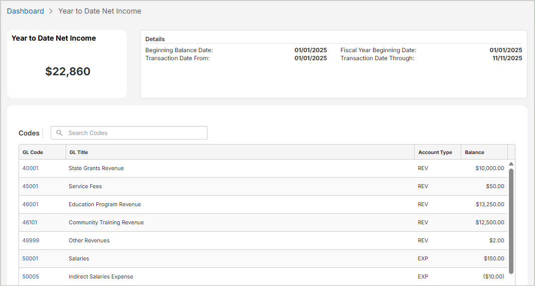 To search for a specific GL code, enter the code into the search box at the upper left corner of the grid. All the transactions that match will display in the grid. To view an individual code, select the GL Code from the grid.