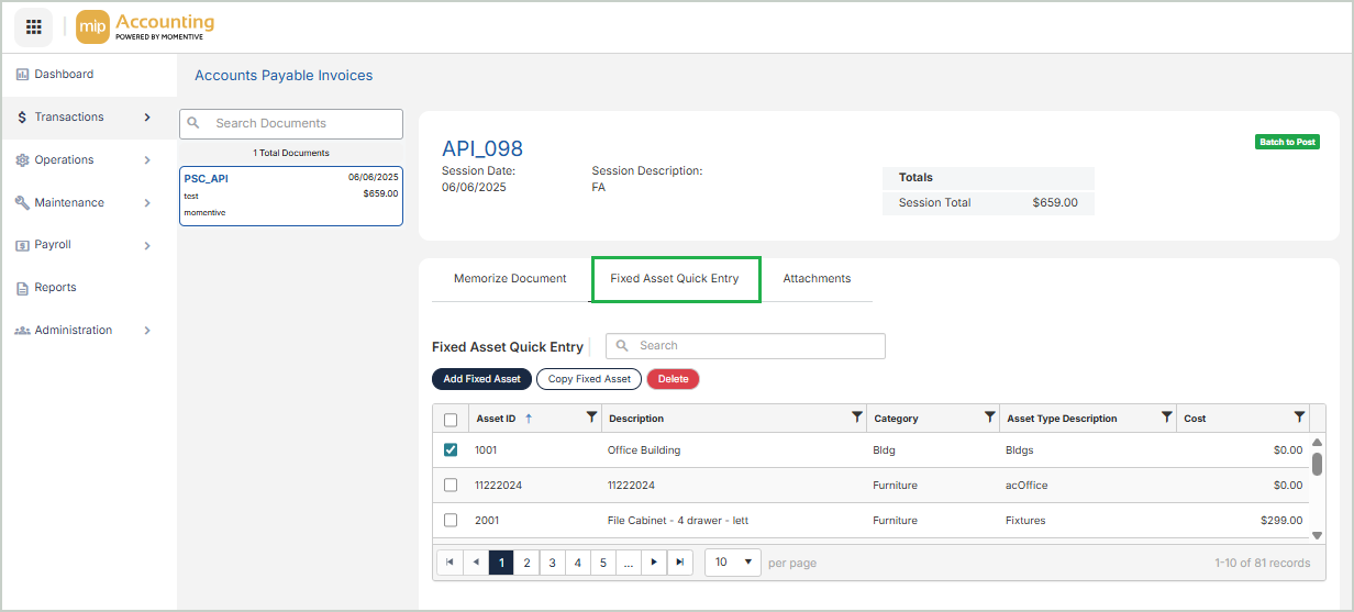 Fixed Asset Quick Entry is available within the Accounts Payable and Cash Disbursements modules. It's an easy way to add an asset to a cash disbursement or AP invoice without having to exit the session. The option becomes available when you select a GL segment with an account type of FAO.