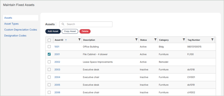 The Fixed Assets page displays a complete list of your assets. You can add new assets and manage asset types, custom depreciation codes, and designation codes. If you've added an asset using Fixed Asset Quick Entry (through a cash disbursement or AP invoice), you'll find it on this page.
