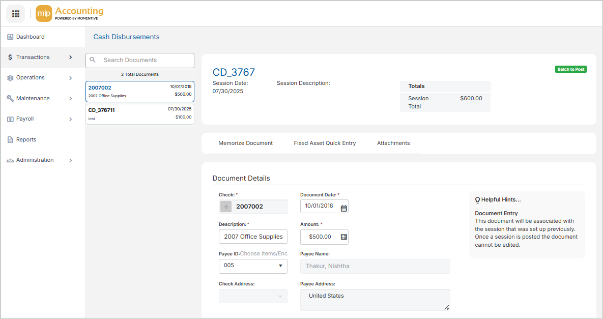 The Document ID, Document Description, Document Date, and Document Effective Date will auto-populate based on the memorized document you selected above. You can leave these as-is or enter new values. Note that the Document ID can't be the same as an existing ID in this session.