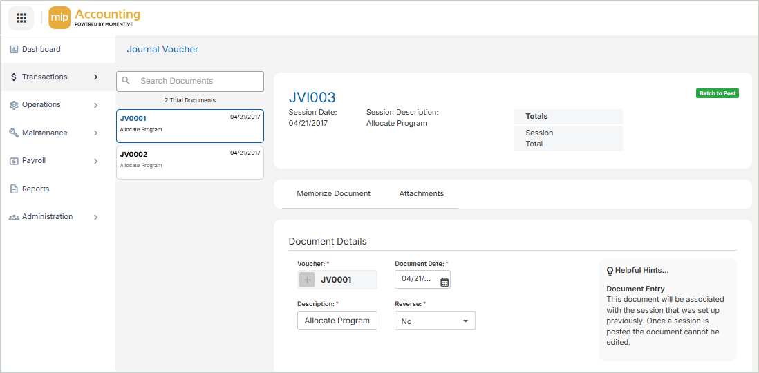 Save the document when you’re finished entering document details and transactions. You have three save options: