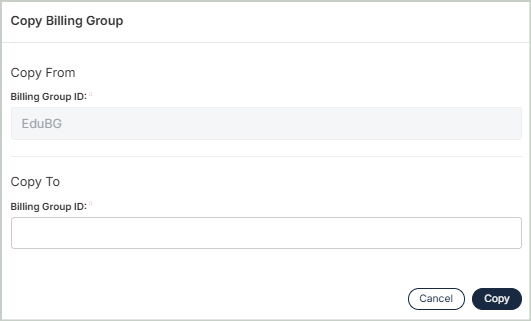 You can create an exact duplicate of an existing billing group. Simply select the billing group to copy from and enter a new name to copy to. Once you select Copy, you'll see your new billing group in the grid.