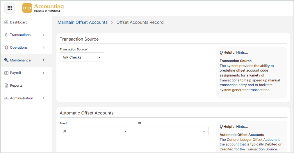 MIP provides the ability to predefine offset account code assignments for a variety of transactions to help speed up transaction entry and facilitate system generated transactions.