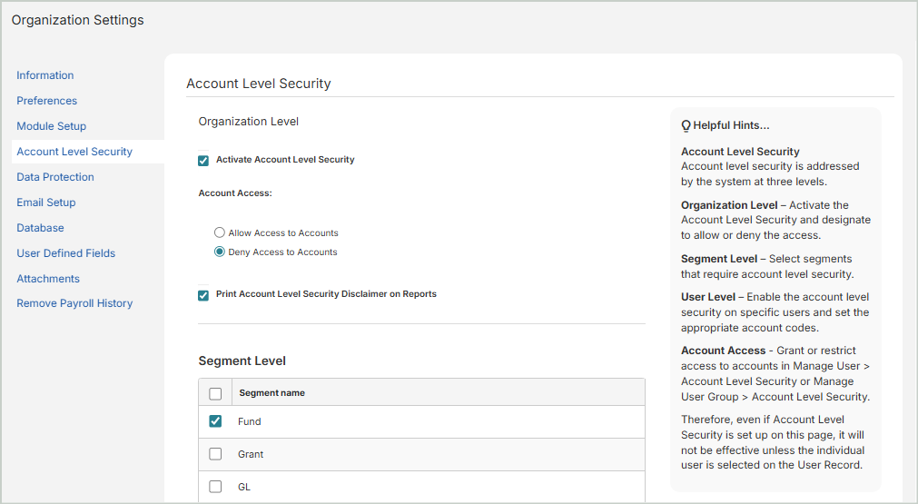 Segment Level – Choose which account segments will be subject to account level security restrictions.