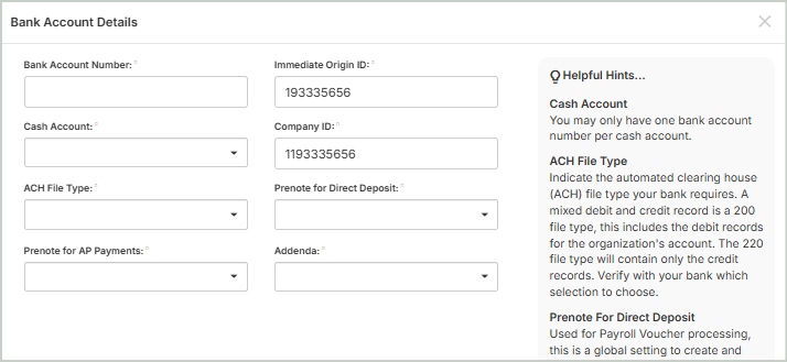 Immediate Origin ID: Enter the ID assigned by the Automated Clearing House (ACH) Operator (bank) for this account. Note that the ACH Operator supplies this information when signing up for electronic funds transfer. This field defaults to the Federal Tax ID Number entered through Administration > Organization Settings > Information.