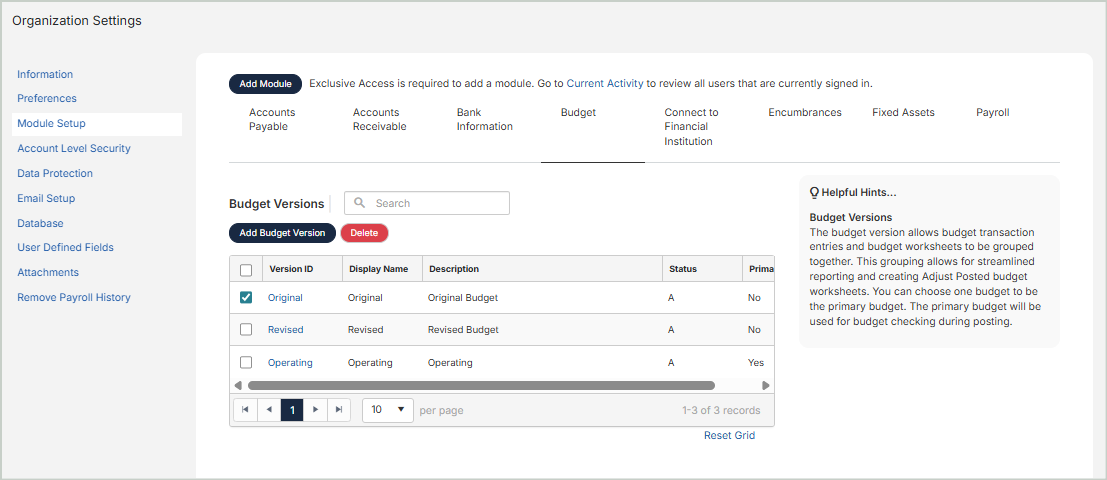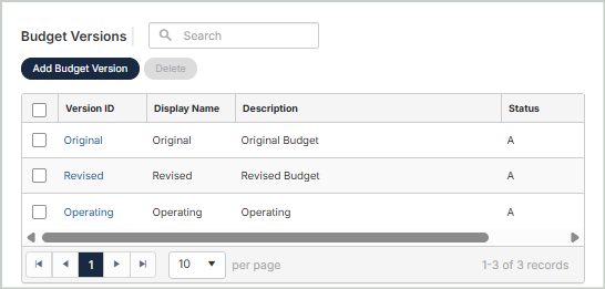 Use the Budget tab to set up multiple budget versions for your organization. A budget version allows budget transaction entries and budget worksheets to be grouped together. This grouping allows for streamlined reporting and creating Adjust Posted Budget worksheets.