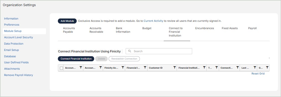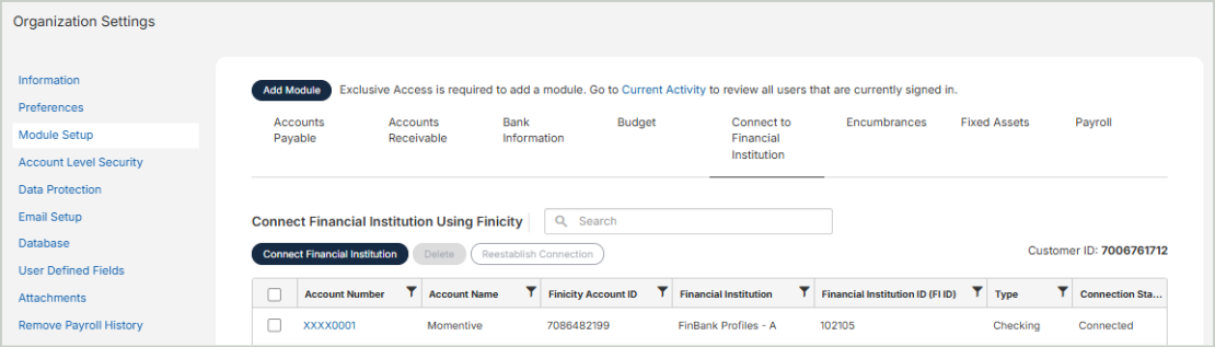 Use the Connect to Financial Institution tab to link a general ledger code to your bank account to enable automatic bank reconciliation. MIP integrates with Mastercard’s open banking platform (Finicity) to easily add your financial account information. All data is encrypted for your protection.