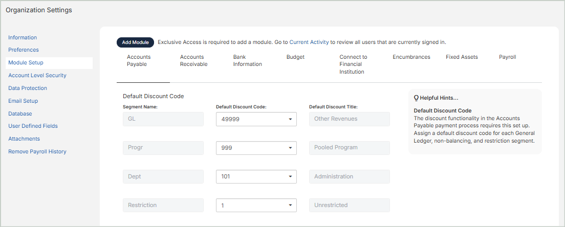 Assign default discount codes for each general ledger, non-balancing, and restriction segment. The discount functionality in the Accounts Payable payment process requires this set up.