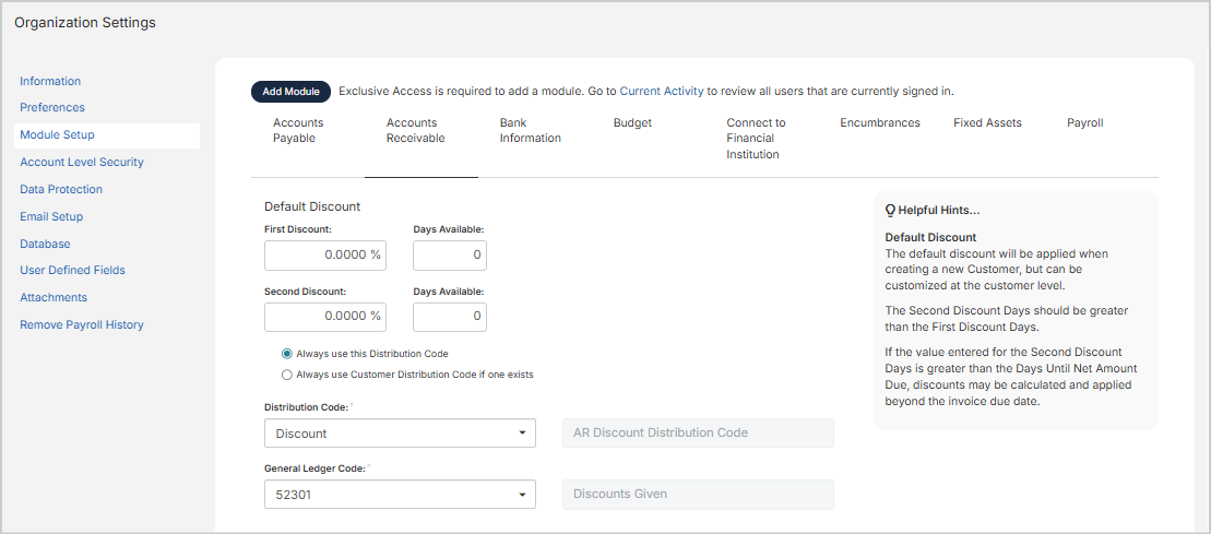 The Accounts Receivable tab contains the following settings to apply for your organization.