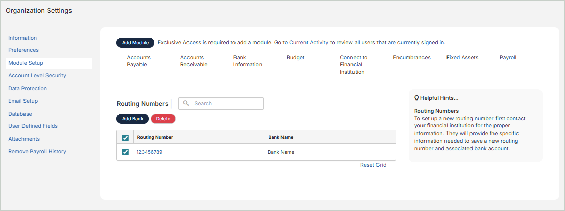 Routing Number: The routing number associated with the bank. Select a routing number to display the Bank Information, Bank Accounts, and Bank Holidays page.