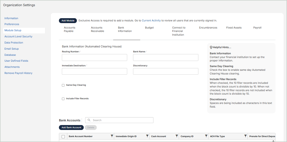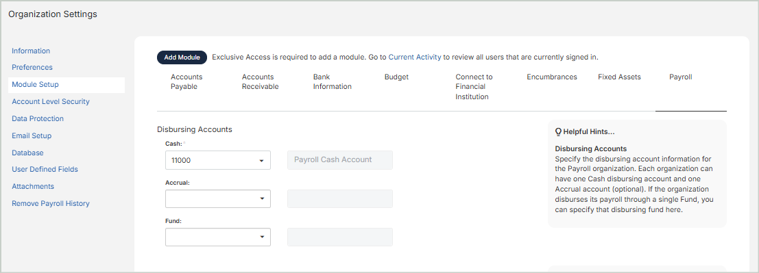 The Payroll tab contains the following settings to apply for your organization, including payroll disbursing accounts and interfund accounts and additional customization options.