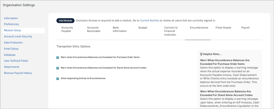 Allow appending entries to encumbrances: Select this option to allow appending entries for an existing encumbrance. If this option is selected, you will be able to adjust a balance and reclassify a GL code for any existing encumbrance by posting an appending entry to the Vendor and Document Number of the original encumbrance.