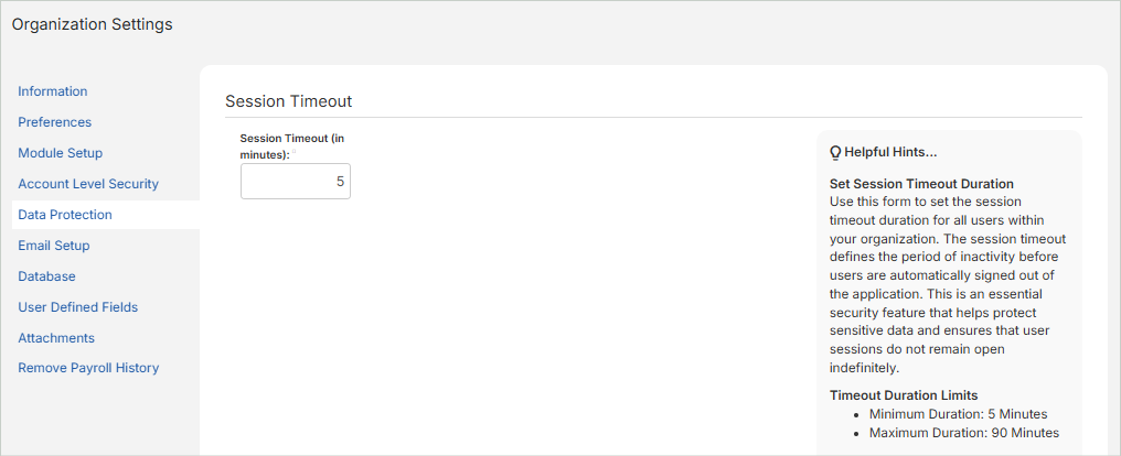 Use the Data Protection section in Organization Settings to set the session timeout duration for all users within your organization. The session timeout defines the period of inactivity before users are automatically signed out of MIP. This notification is an essential security feature that helps protect sensitive data and ensures that user sessions do not remain open indefinitely.