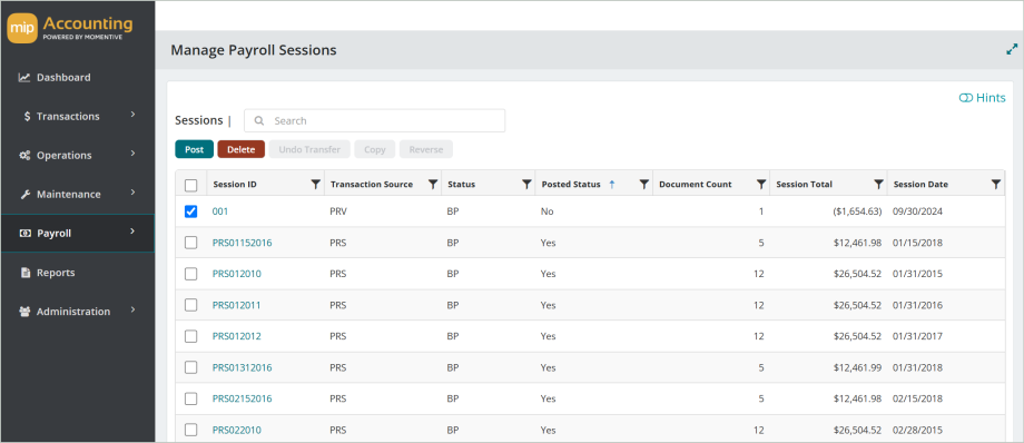 From here you can post a session, delete an unposted session, undo a session transfer to accounting to make any edits, copy a session, or reverse a posted session.