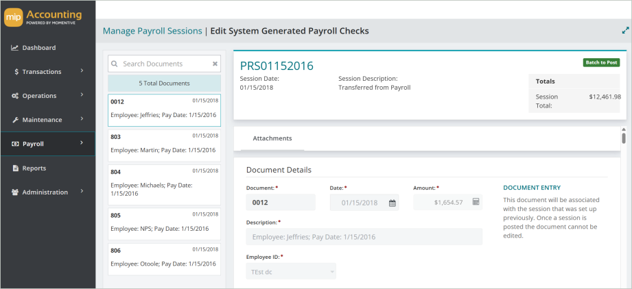 This view displays each entry that will be made to your GL when you post the session. In the image above, the individual documents are the employee paychecks for that payroll session, and the entries that the system will make once this session is posted.