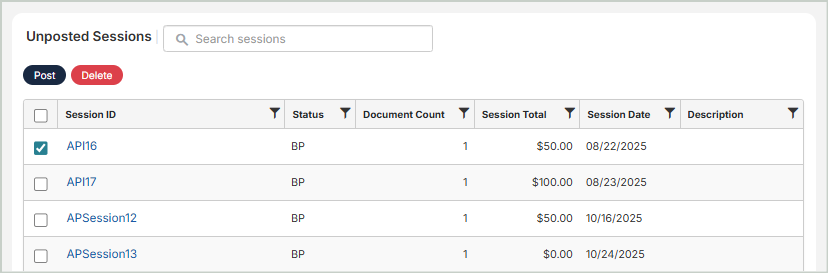 Post - To post a session, select it from the grid, then select Post. You can only post sessions that have a status of BP.