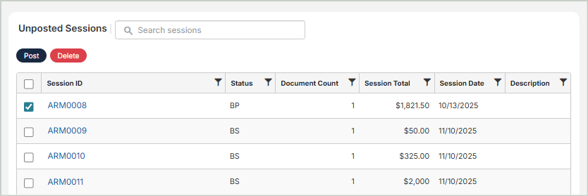 Post - To post a session, select it from the grid, then select Post. You can only post sessions that have a status of BP.