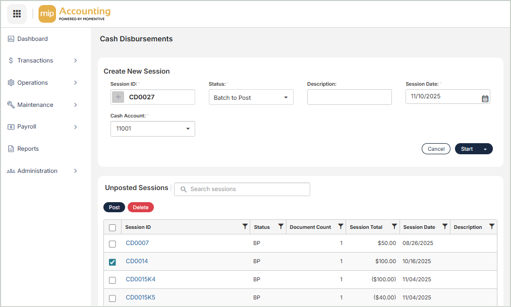 Post - To post a session, select it from the grid, then select Post. You can only post sessions that have a status of BP.