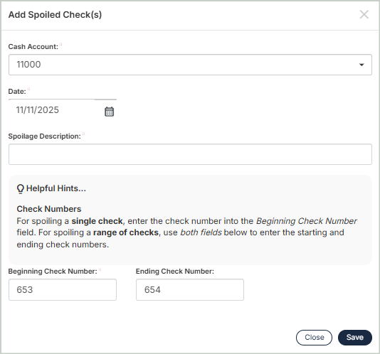 Beginning Check Number/Ending Check Number: Enter the spoiled check number in the Beginning Check Number field or use both the beginning and ending fields to enter a sequential range of check numbers.
