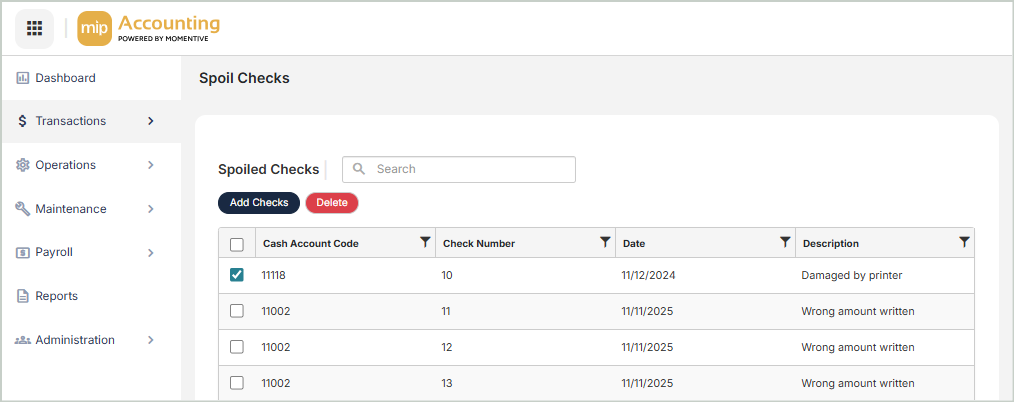 - Mis-numbered checks where the pre-printed check stock and the check number in MIP did not match