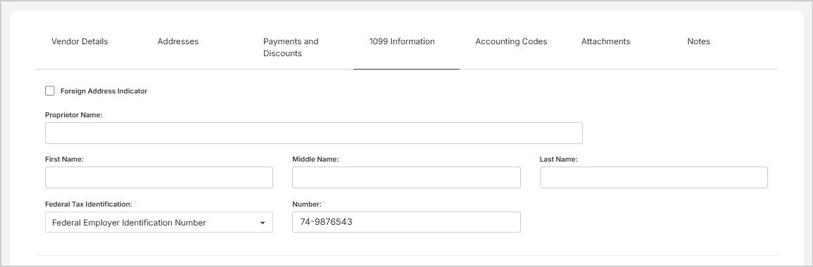 Proprietor Name: Enter the individual's name that prints on the first line of the Recipients Name box on the 1099 form. This field is only needed when it's different than the Vendor Name. For businesses that are operated by individual taxpayers, enter the name of the sole proprietor.